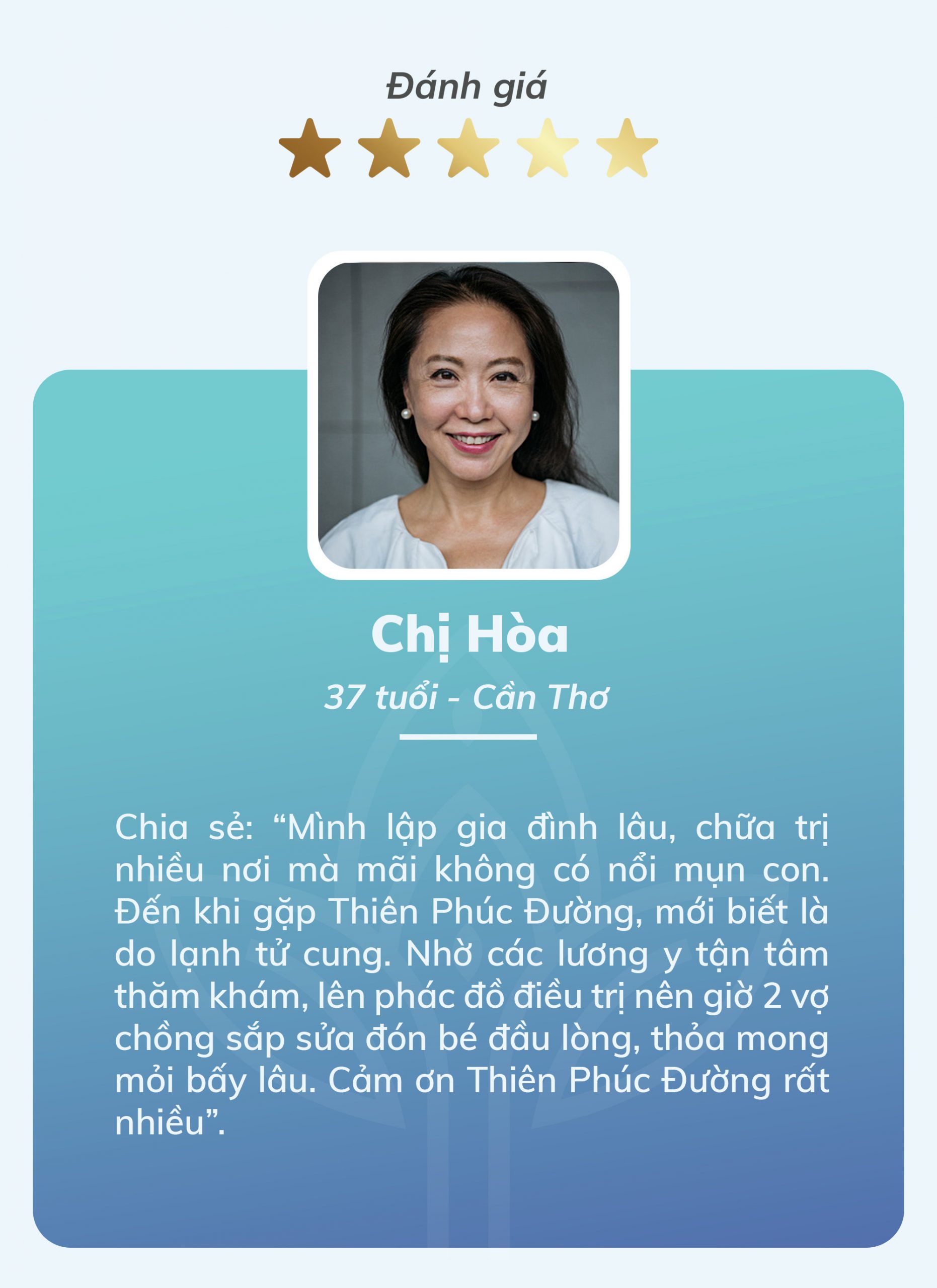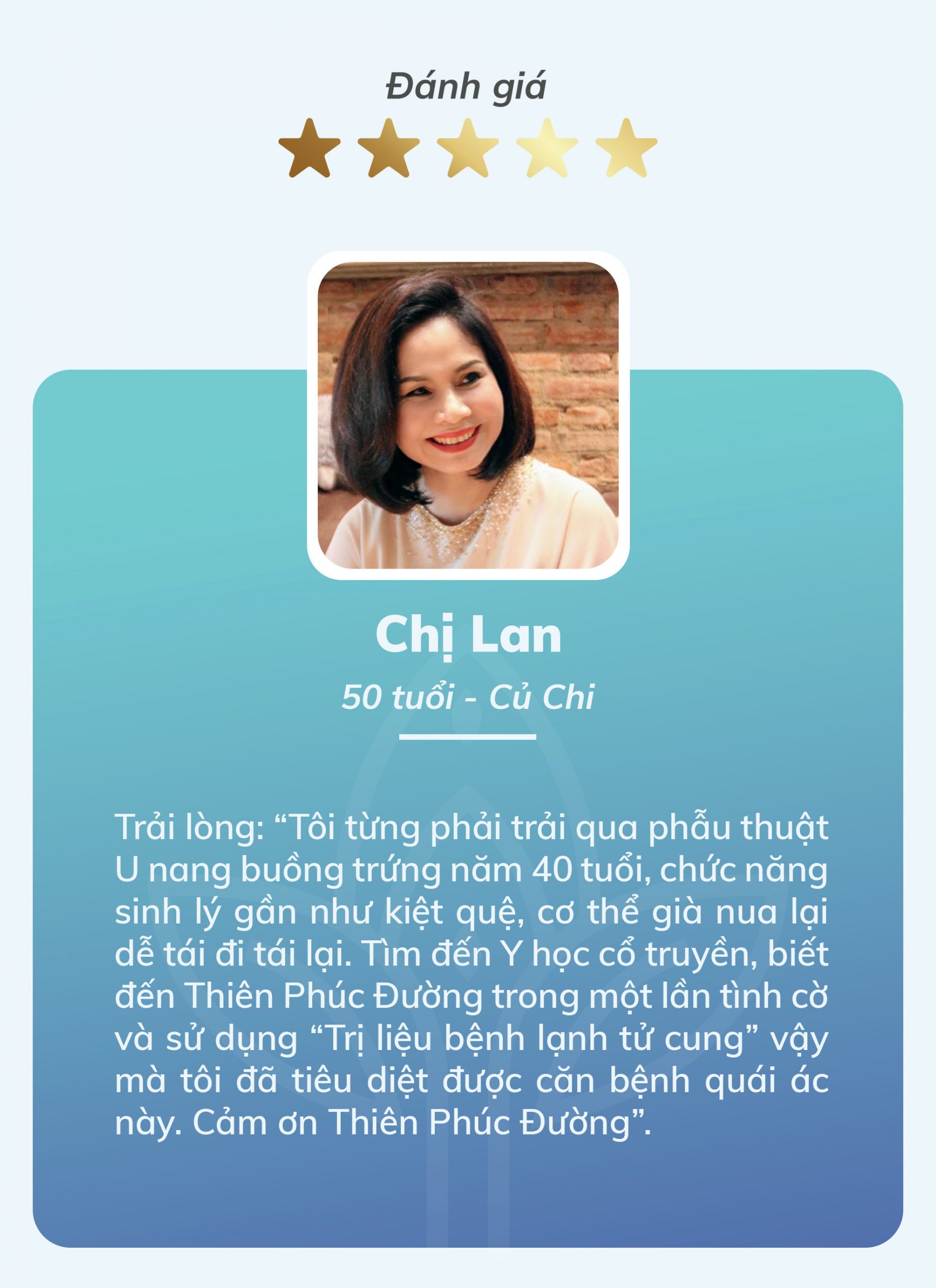 Chị Lan ( 50 tuổi – Củ Chi) trải lòng: “Tôi từng phải trải qua phẫu thuật U nang buồng trứng năm 40 tuổi, chức năng sinh lý gần như kiệt quệ, cơ thể già nua lại dễ tái đi tái lại. Tìm đến Y học cổ truyền, biết đến Thiên Phúc Đường trong một lần tình cờ và sử dụng “Trị liệu bệnh lạnh tử cung” vậy mà tôi đã tiêu diệt được căn bệnh quái ác này. Cảm ơn Thiên Phúc Đường”.