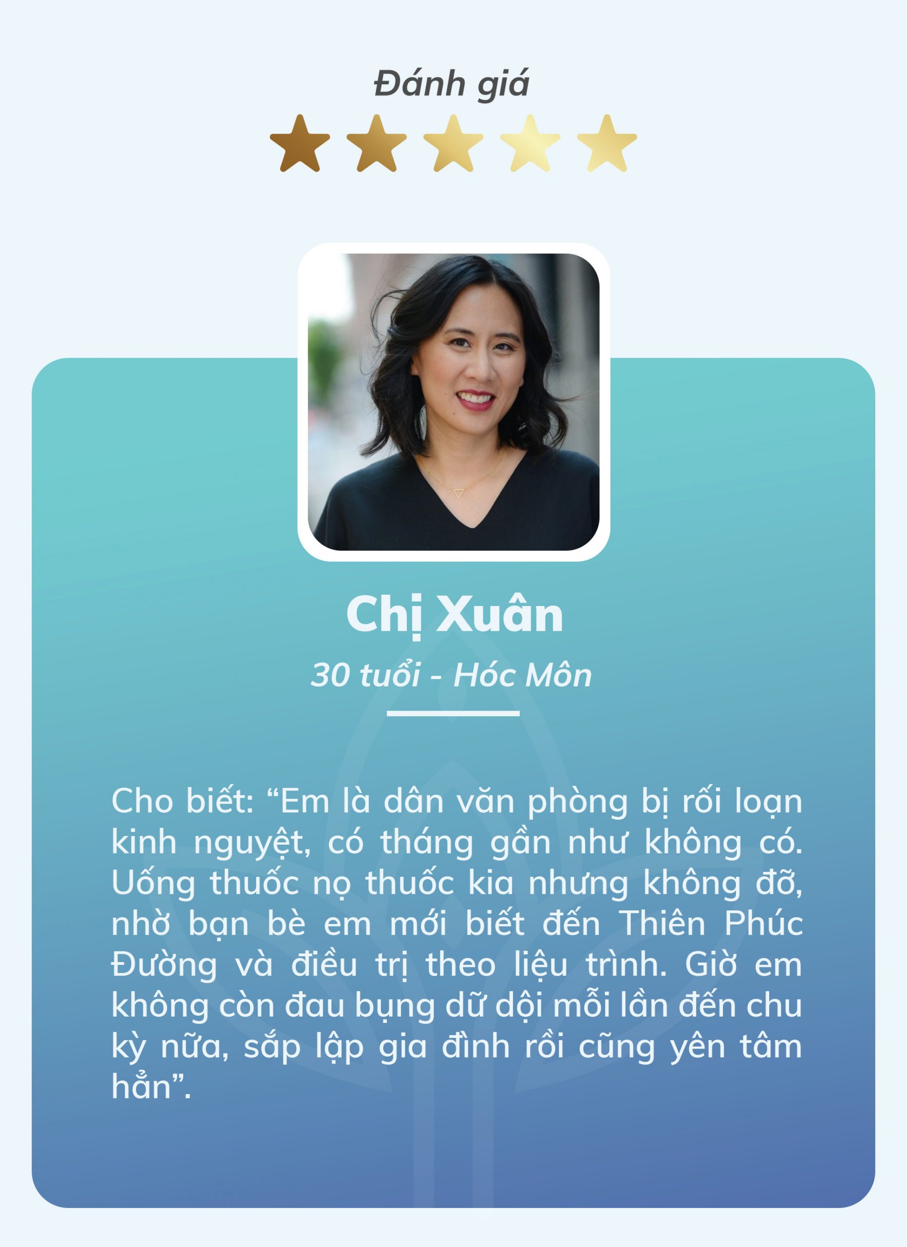 Chị Xuân ( 30 tuổi – Hóc Môn) cho biết: “Em là dân văn phòng bị rối loạn kinh nguyệt, có tháng gần như không có. Uống thuốc nọ thuốc kia nhưng không đỡ, nhờ bạn bè em mới biết đến Thiên Phúc Đường và điều trị theo liệu trình. Giờ em không còn đau bụng dữ dội mỗi lần đến chu kỳ nữa, sắp lập gia đình rồi cũng yên tâm hẳn”.