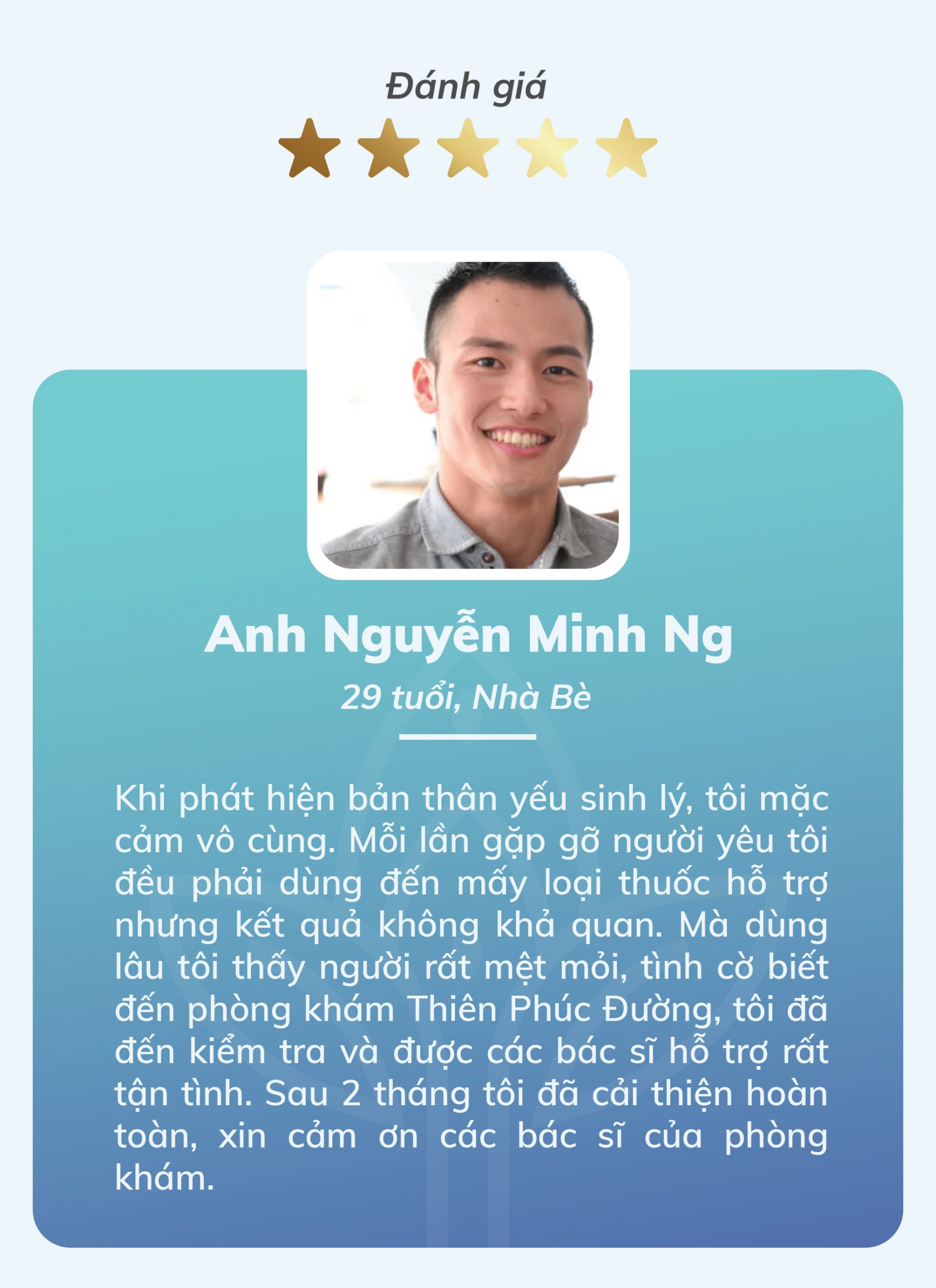 Anh Nguyễn Minh Ng (29 tuổi, Nhà Bè): Khi phát hiện bản thân yếu sinh lý, tôi mặc cảm vô cùng. Mỗi lần gặp gỡ người yêu tôi đều phải dùng đến mấy loại thuốc hỗ trợ nhưng kết quả không khả quan. Mà dùng lâu tôi thấy người rất mệt mỏi, tình cờ biết đến phòng khám Thiên Phúc Đường, tôi đã đến kiểm tra và được các bác sĩ hỗ trợ rất tận tình. Sau 2 tháng tôi đã cải thiện hoàn toàn, xin cảm ơn các bác sĩ của phòng khám.