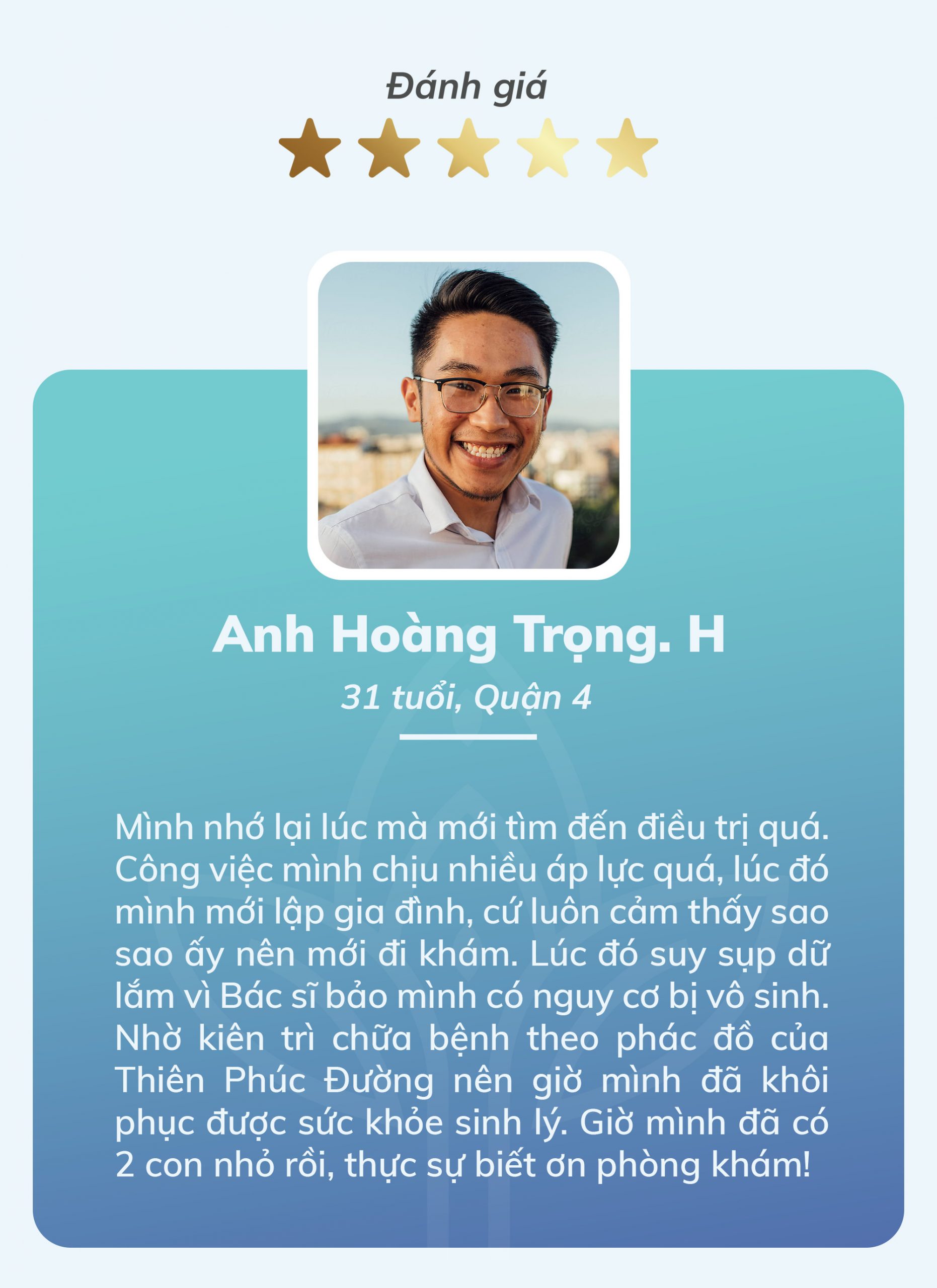 Anh Hoàng Trọng. H (31 tuổi, Quận 4): Mình nhớ lại lúc mới tìm đến điều trị quá. Công việc mình chịu nhiều áp lực, lúc đó mình mới lập gia đình, cứ luôn cảm thấy sao sao ấy nên mới đi khám. Lúc đó suy sụp dữ lắm vì Bác sĩ bảo mình có nguy cơ bị vô sinh. Nhờ kiên trì chữa bệnh theo phác đồ của Thiên Phúc Đường nên giờ mình đã khôi phục được sức khỏe sinh lý. Giờ mình đã có 2 con nhỏ rồi, thực sự biết ơn phòng khám!